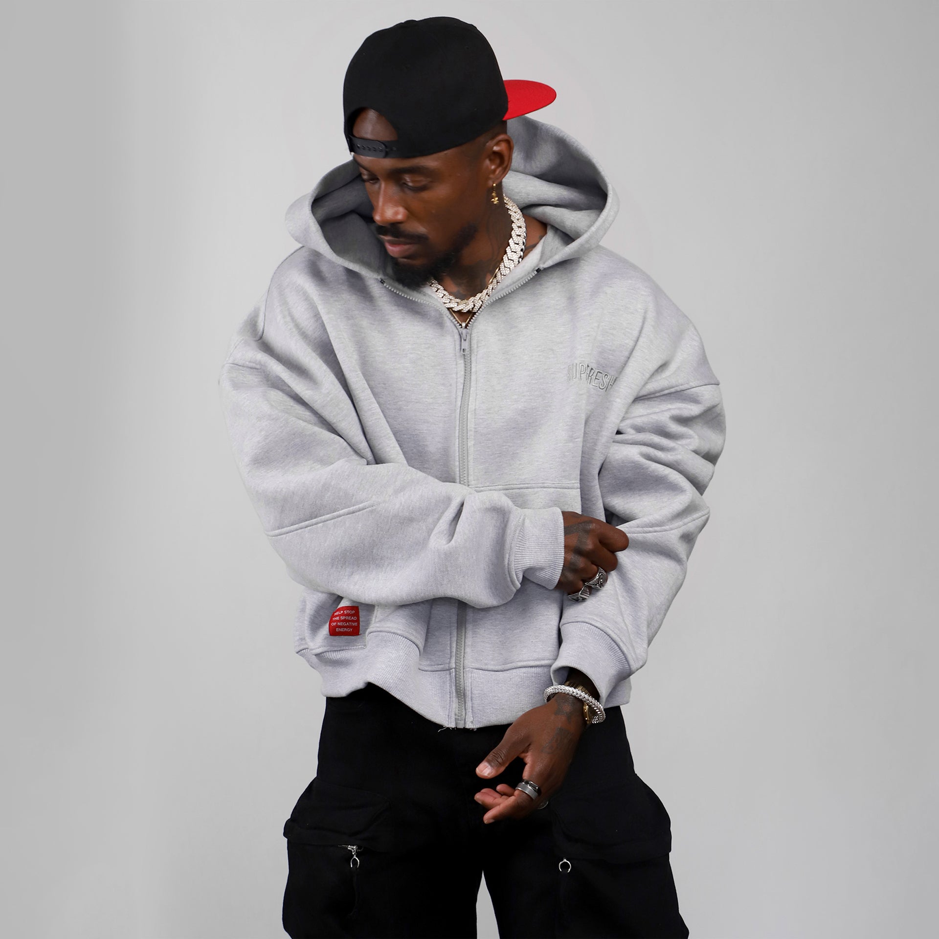 Grey zip-up hoodie with short sleeves. A unique and comfortable style.